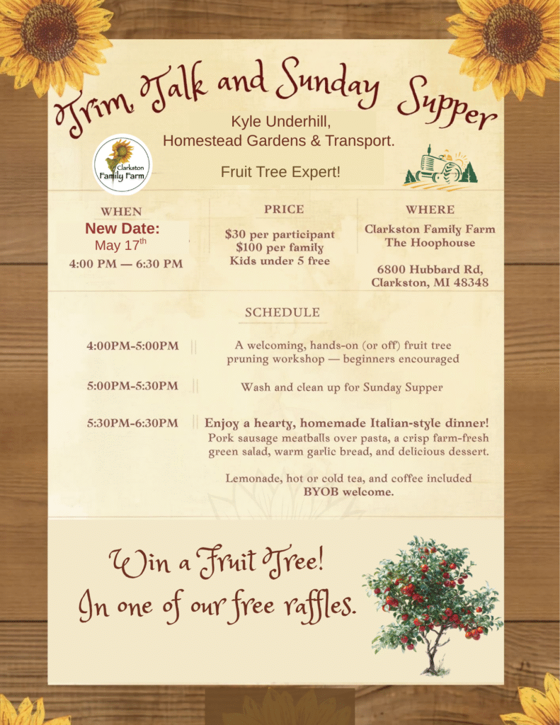 We’re hoping to expand that reach even further, and we’d love for you to be part of it. Please consider joining us for a Trim Talk and Sunday Supper with guest expert Kyle Underhill of Homestead Gardens & Transport.
